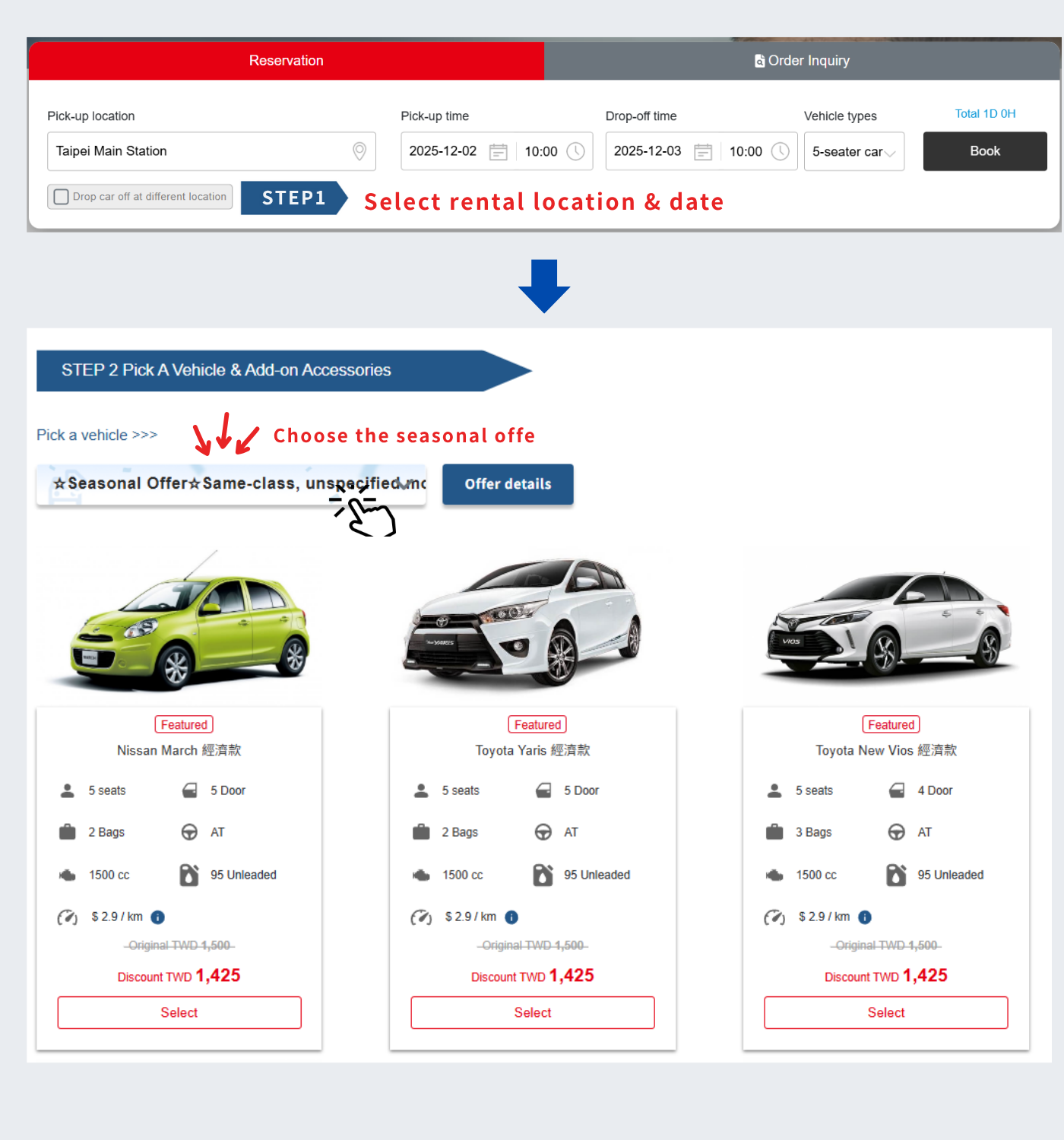 2.It is not valid for consecutive 3 days or longer holidays, and cannot be combined with other promotions. All prices include taxes and insurance fees.